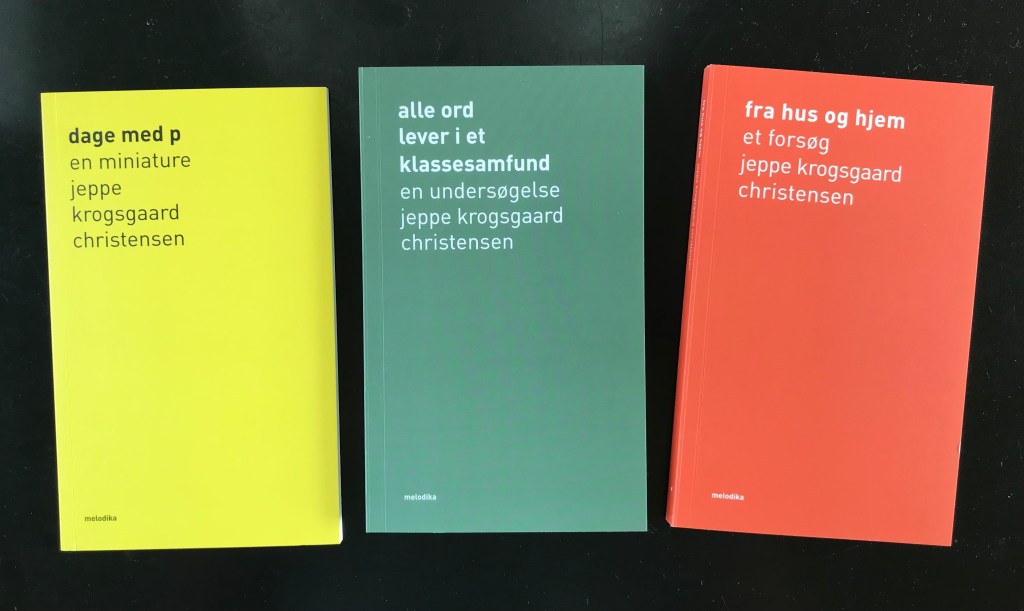 Det er Jeppe tredje bog på Melodika og på mange måder kan man sige, at bogen fuldender den uannoncerede trilogi, som blev indledt med ‘dage med’ (2017) og hvor nr. 2 i rækken var ‘alle ord lever i et klassesamfund (2020), som netop er blevet trykt i 2. oplag.